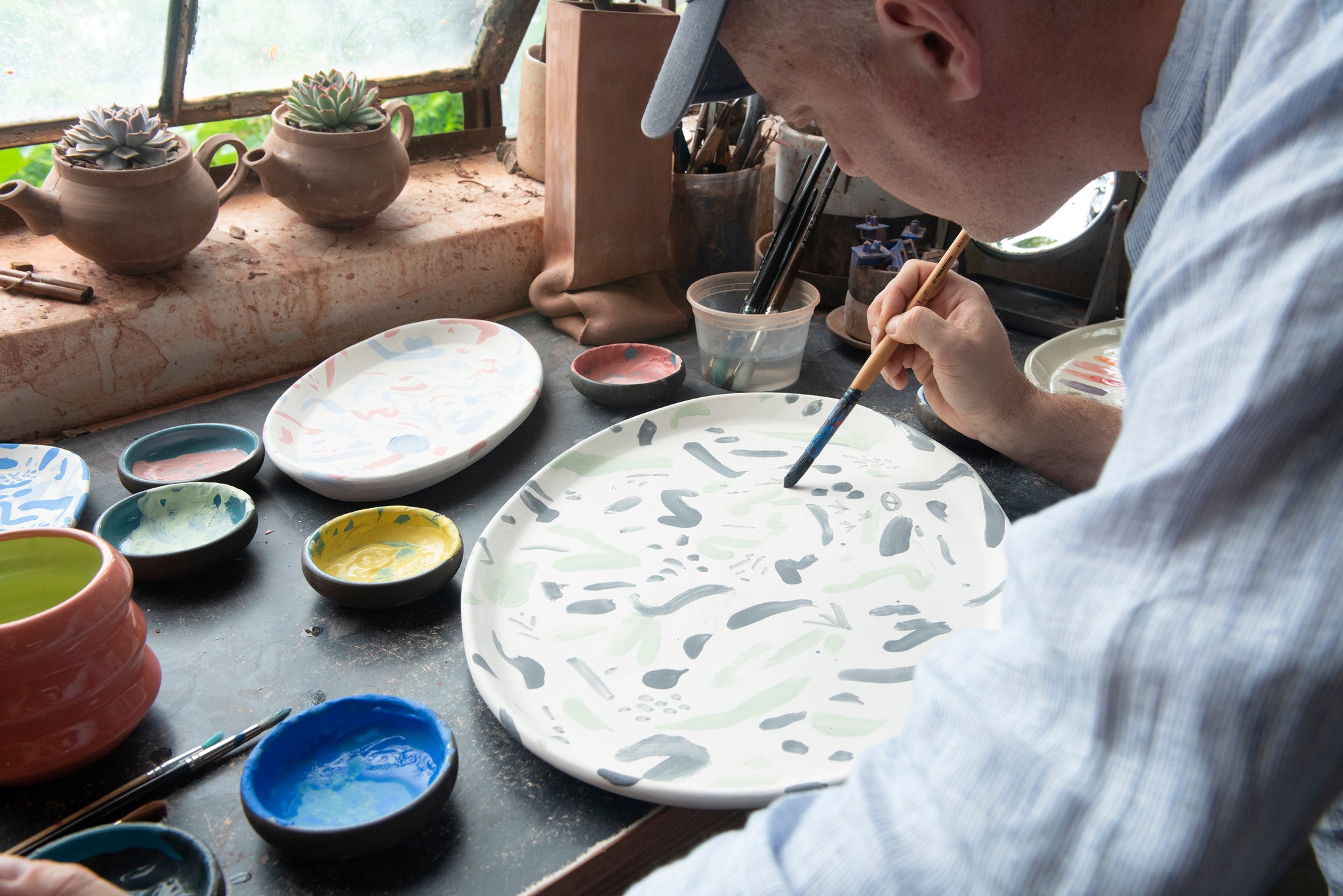 For August 2022, we’re releasing a new kind of Special Edition: An artist collaboration featuring 43 one-of-a-kind hand-decorated porcelain trays. The pieces, which are Serving Platters that come in two sizes, were each made by Jono and decorated in our studio by Gordon Hull. Jono and Gordon have been friends for many years, and Jono has had a collaboration in mind since he saw Gordon’s unique brushwork while visiting his house on Long Island. “I approach my work with a lot of energy and as much spontaneity as possible,” explains Gordon. “I let that dictate the choices I make. Each mark is definitive—there’s no going back. This makes everything a game of chance and raises the stakes to get it right with every stroke—or to find a way to fix what isn’t working.” This makes working with ceramics even more exciting. “Ceramics are interesting because, again, you can't erase,” says Gordon. “I love the whole Jono vibe—it's got this gorgeous, musical, earthy, considered minimalism. And it’s fabulous as a foundation for its intended purpose—to provide enjoyment and aesthetic beauty to its use.” Whether you decide to display your piece on a mantel or incorporate it into your next tablescape, you can rest assured that there will be nothing else out there quite like it.