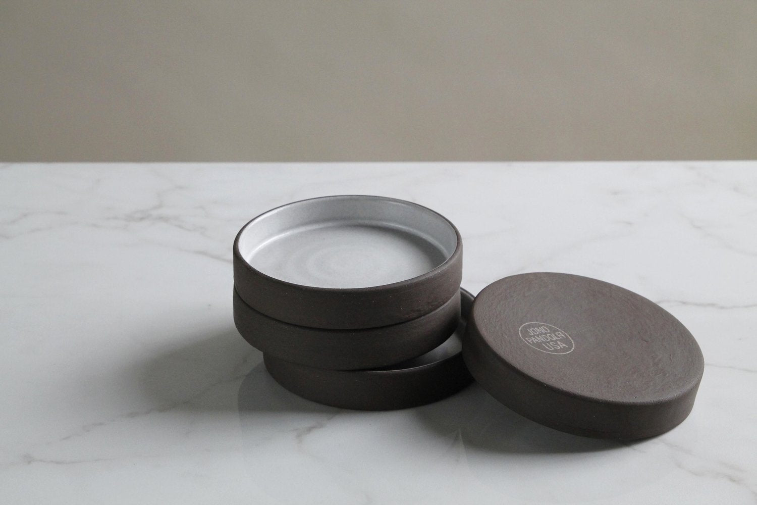 Dark Brown / White is our foundational clay and glaze combination, available in the largest assortment of shapes. With this pairing, we apply a slightly thinner coat of glaze than on our Toasted clay—enabling some of the darker clay beneath to be seen and giving the glaze an off-white tone.