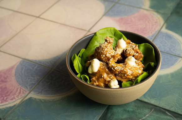 Serving: Fried Chicken, Kimchi Vinaigrette, & Kewpie Mayo