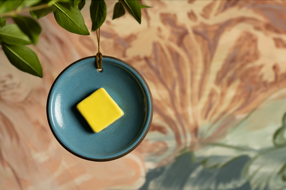Our fourth annual Jono Pandolfi ornament is a Coupe Butter Plate in Dark Brown clay with a Warm Sky Blue glaze and a yellow slice of (ceramic) butter. Proof that butter really does make everything better!