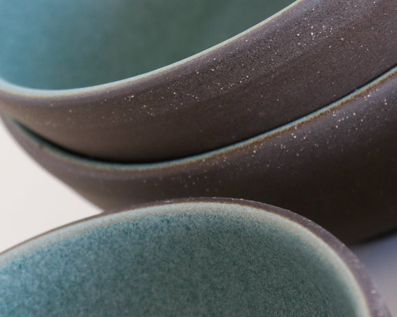 Each of our pieces are made up of a clay body and a glaze — this is the best way to think about how you’ll build your collection. When the clay and glaze are combined, you’ll see there is often a unique end result. (For example, if you have a thin glaze on a dark clay, you’re going to see more of the clay beneath the glaze, which causes the glaze to have a slightly darker, earthier tone.) It’s part of what makes handmade ceramics special, but it’s also something to be aware of when you’re shopping.