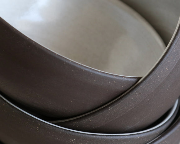 Our Toasted clay with White glaze has a brigher finish than our Dark Brown clay with white glaze. The clay also has grog—pre-fired, ground pottery that’s mixed into clay—which is a bit rougher in our Toasted clay than in our Dark Brown clay, but it smoothes out over time. (Think of it like breaking in a pair of raw denim, except you do none of the work.)