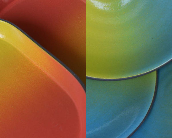 Something to be aware of: Little dark brown or black speckles may appear on the surface of the glaze where bits of iron come through. In addition, the brighter white glaze on this combination is more susceptible to cutlery marks, which can be easily buffed out with Barkeepers Friend.