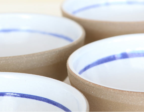On this option, our Toasted clay and white glaze are topped with a hand-painted blue band near the inside rim of the piece. Each band is different from the last, with darker tones of blue where the brushstrokes overlap. You will sometimes see tiny specks of blue paint on the white glaze — a result of the band being painted as the piece is spinning on the wheel.